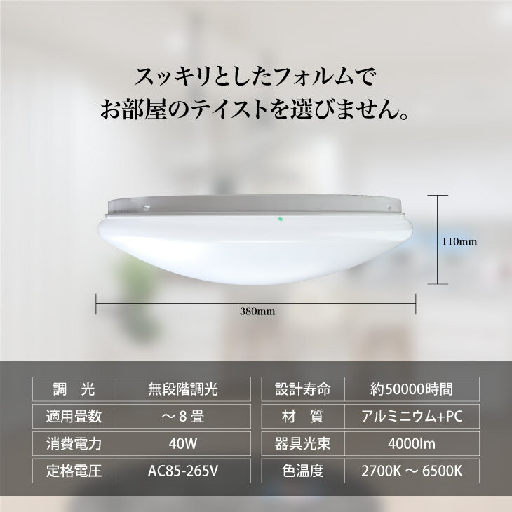 【製品仕様】 商品名:LEDシーリングライト 付属品:シーリングライト本体×1、リモコン×1、説明書 サイズ:直径…約380mm 高さ…約110mm 演色性:Ra80以上 消費電力:40W 全光束:4000lm 色温度:2700〜6500K 調光機能:無段階調光 オフタイマー機能:15分/30分 保証期間:1年保証 保証期間内の故障につきまして、商品本体に起因する故障の場合、商品代金は無料で対応させていただいております。