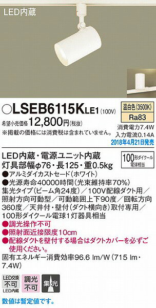 LSEB6115KLE1 パナソニック の商品の詳しい仕様はメーカー受付窓口/HPにてご確認ください。