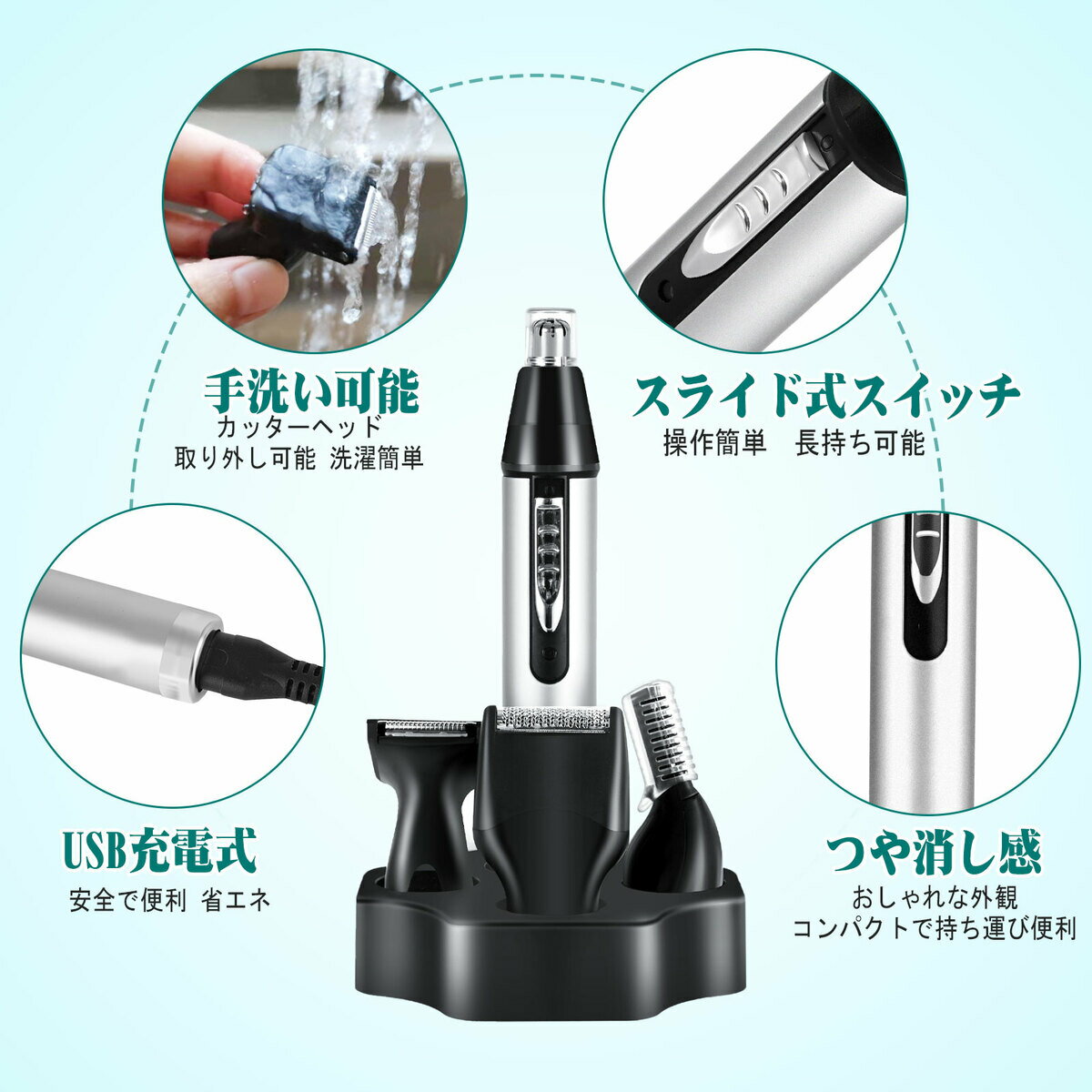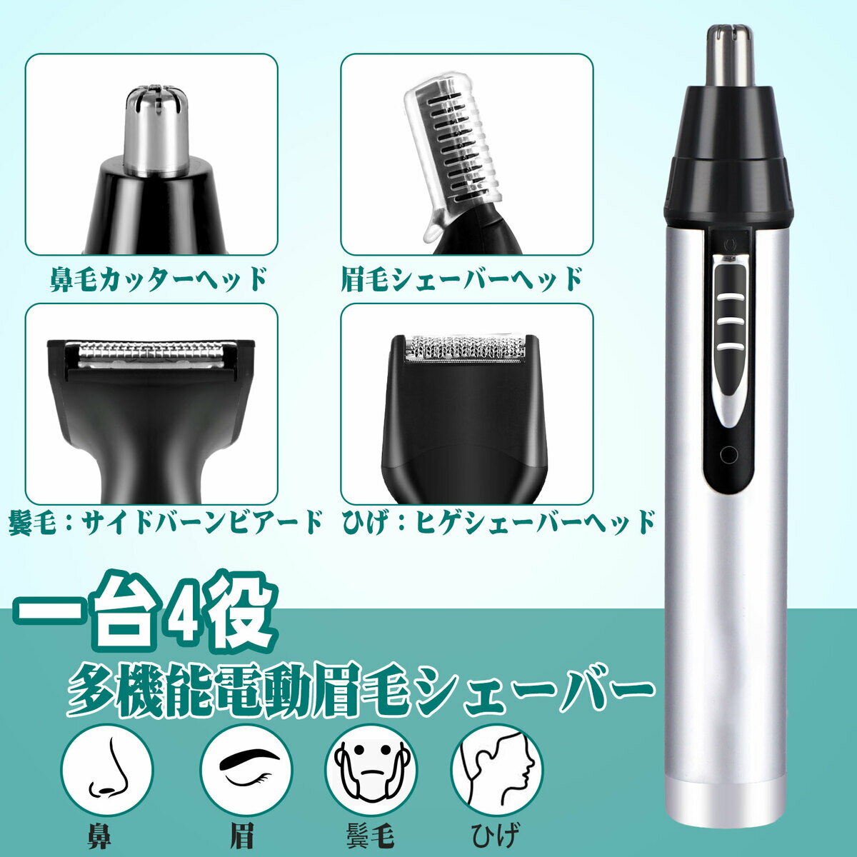 【多機能電動鼻毛トリマー&4 in 1】 本製品は鼻毛トリマー、眉毛トリマー、耳毛トリマー、ヒゲトリマーの4 in 1セットです。