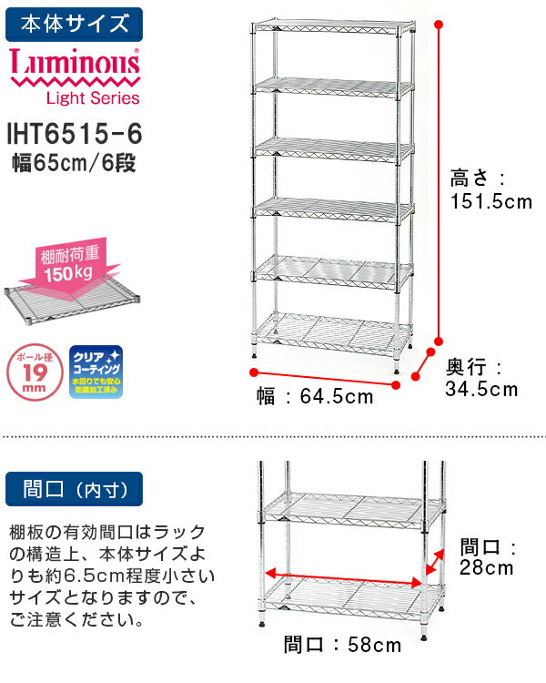ルミナス ラック スチールラック 幅65 奥行35 メタル ラック 棚 6段 業務用 収納 スリム スチールシェルフ メタル 棚 シェルフ オープンラック 省スペース キッチン収納棚 ライト IHT6515-6 (ST6535/PHT-0150SL)