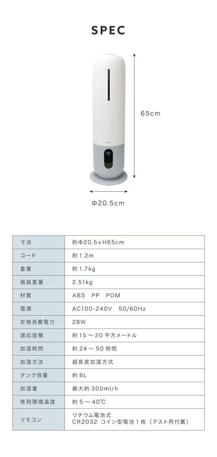 【商品詳細】・寸法約Φ20.5xW65cm・コード約1.2m・重量約1.7kg・個装重量2.51kg・材質ABS PP POM・電源AC100-240V 50/60Hz・定格消費電力28W・適応面積約15〜20平方メートル・加湿時間約24〜50時間・加湿方法超音波加湿方式・タンク容量約8L・加湿量最大約300ml/h・使用環境温度約5〜40℃・リモコンリチウム電池式CR2032 コイン型電池1枚(テスト用付属)【送料について】北海道、沖縄、離島は別途送料を頂きます。