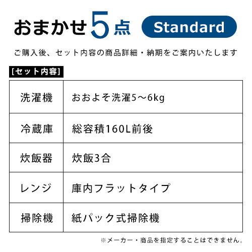 ▼延長保証サービス ※有料 ▼【国内メーカー限定】おまかせ家電5点セット(スタンダード) 内容 新生活に必要な家電5点を弊社で組み合わせます。