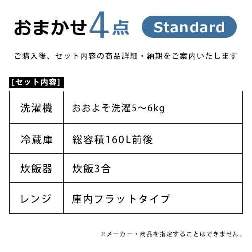 ▼【国内メーカー限定】おまかせ家電4点セット(スタンダード) 内容 新生活に必要な家電4点を弊社で組み合わせます。