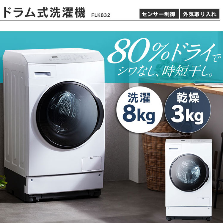 ●ドラム式洗濯機 8kg FLK832 ホワイト●冷凍冷蔵庫 320L IRSN-32A【ドラム式洗濯機 8kg FLK832 ホワイト】温水洗浄でニオイ・黄ばみを徹底除去!80%ドライで、シワなく部屋干しができるドラム式洗濯機です。