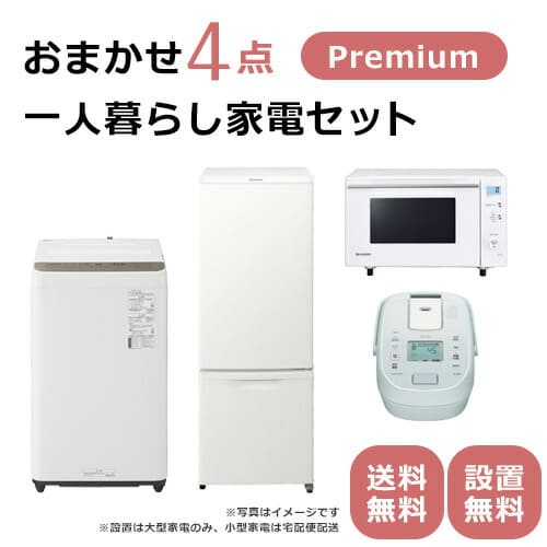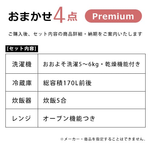 ▼【国内メーカー限定】おまかせ家電4点セット(プレミアム) 内容 新生活に必要な家電4点を弊社で組み合わせます。