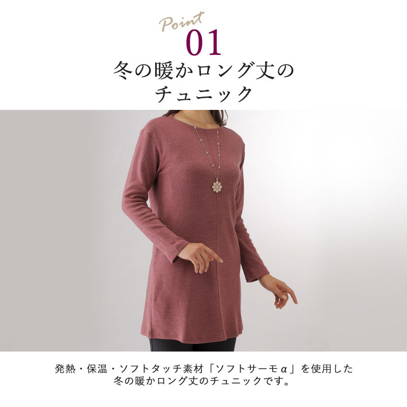商品詳細発熱・保温・ソフトタッチ素材「ソフトサーモα」を使用した冬の暖かロング丈のチュニックです。