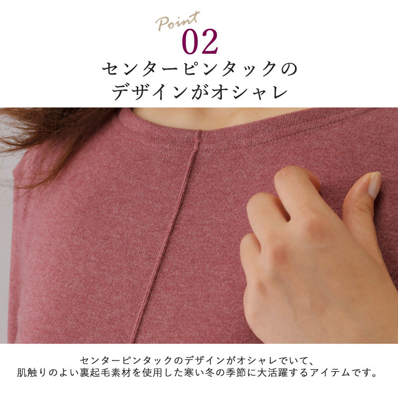 センターピンタックのデザインがオシャレでいて、肌触りのよい裏起毛素材を使用した寒い冬の季節に大活躍するアイテムです。