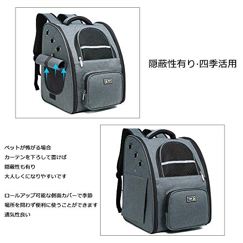 犬 猫用品リュック適正体重:6kg 通気性がよい・3出入り口犬猫 お出かけ リュックの両側にロールアップできるカーテンがあって、通気性良い、ペットが中にいても蒸し暑くない、快適に過ごすことができます。