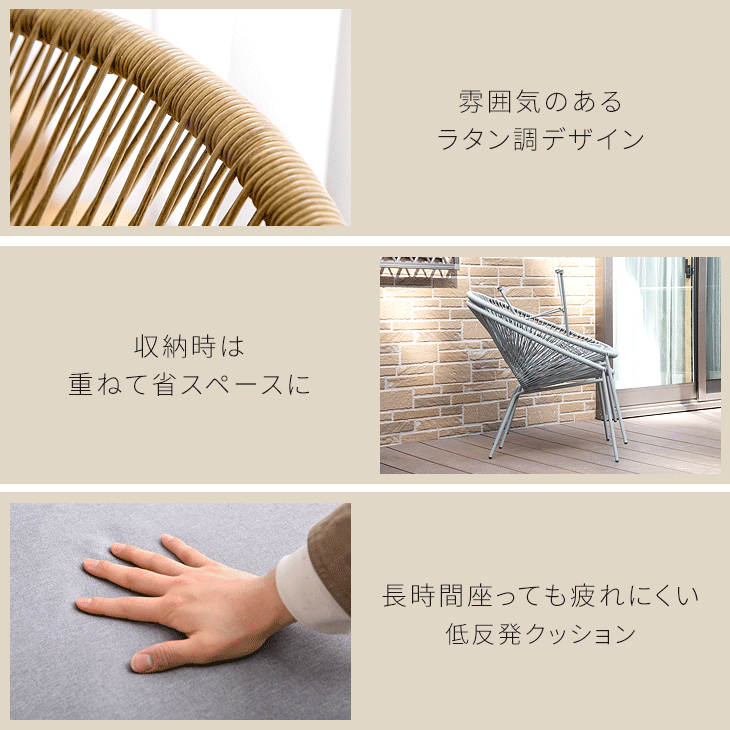 お庭を涼しく、リゾート気分に!▼ガーデンパラソルセットもおすすめ▼仕様サイズチェア外寸:幅72×奥行72×高さ75cm座面高クッション無:41cmクッション有:46cmテーブル外寸:幅45×奥行45×高さ45cm【スタッフむったんのおすすめポイント】・おうち時間を贅沢に!ラタン調ガーデン3点セット・ゆったり体を預けられる 傾斜した座面設計・使わないときは省スペースに収納OK・長時間座っても疲れにくい低反発クッション付・クッションカバーには水や汚れに強い撥水加工・洗濯して清潔に使えるクッションカバー・安心の耐荷重120kg重量チェア:4kgテーブル:3kg耐荷重チェア:約120kgテーブル:約20kg素材【テーブル・チェア】フレーム:スチール(粉体塗装)コード:人工ラタン(PE製)脚先:プラスチック【クッション】張地:ポリエステル(撥水加工)中材:低反発ウレタン梱包サイズ73×77×82cmカラーシアーナチュラル・アッシュグレー生産国中国送料【送料無料(北海道・沖縄県・離島は別途送料が発生します。
