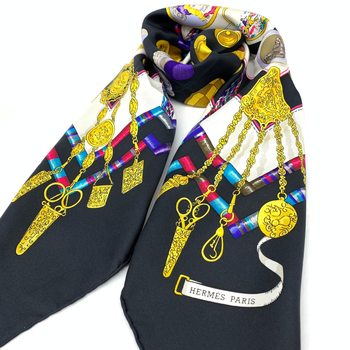 【中古】HERMES◆カレ90/Petite main/お針子さん/スカーフ/シルク/BLK/総柄【服飾雑貨他】